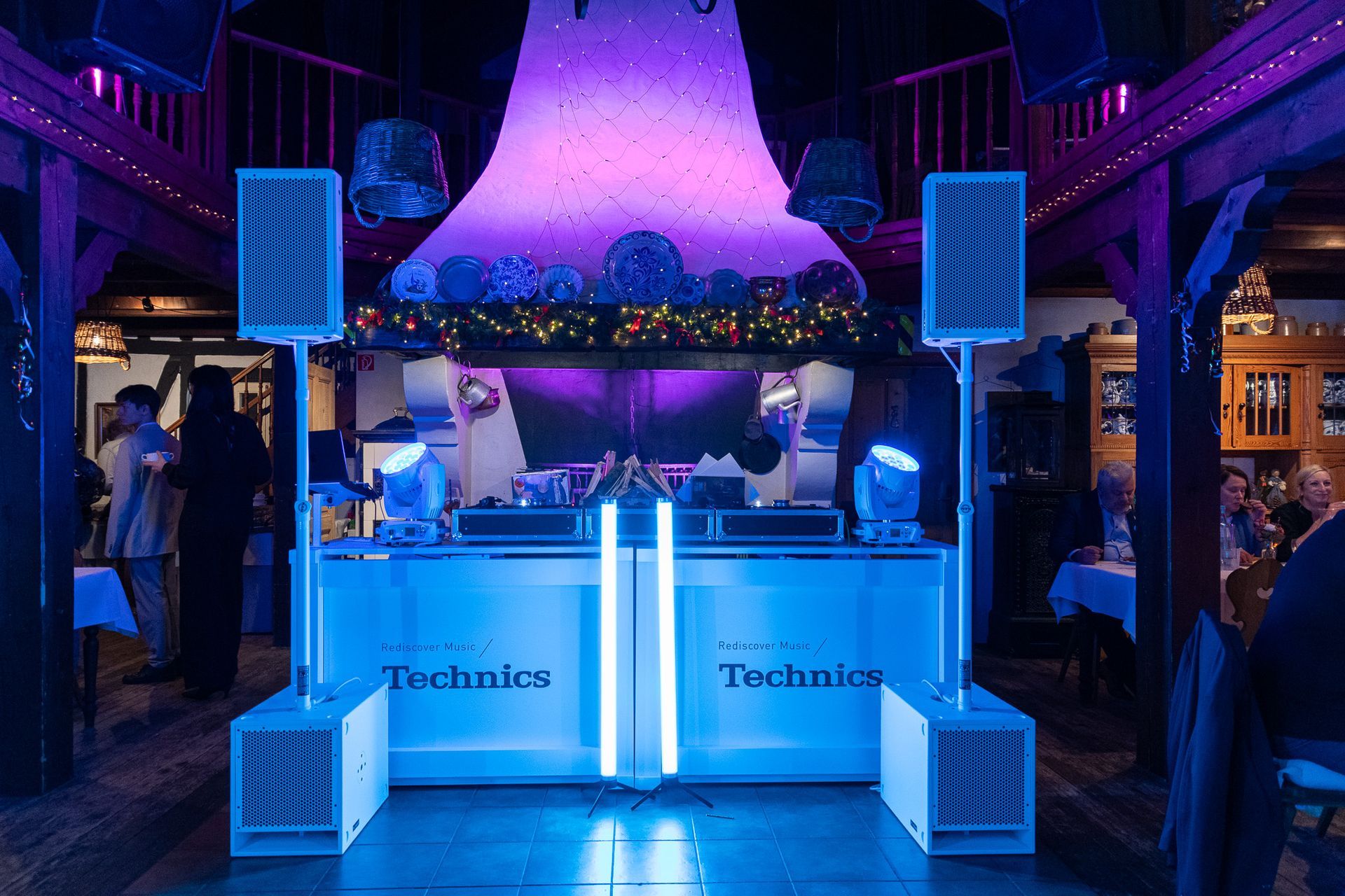 Powered by Technics x Lamborghini SL-1200 m7b Turntables, Ortofon Elite Abtastsystem, Alpha Theta Euphonia Rotary Mixer und Humpter B3 Design-Tische mit Technics Branding.