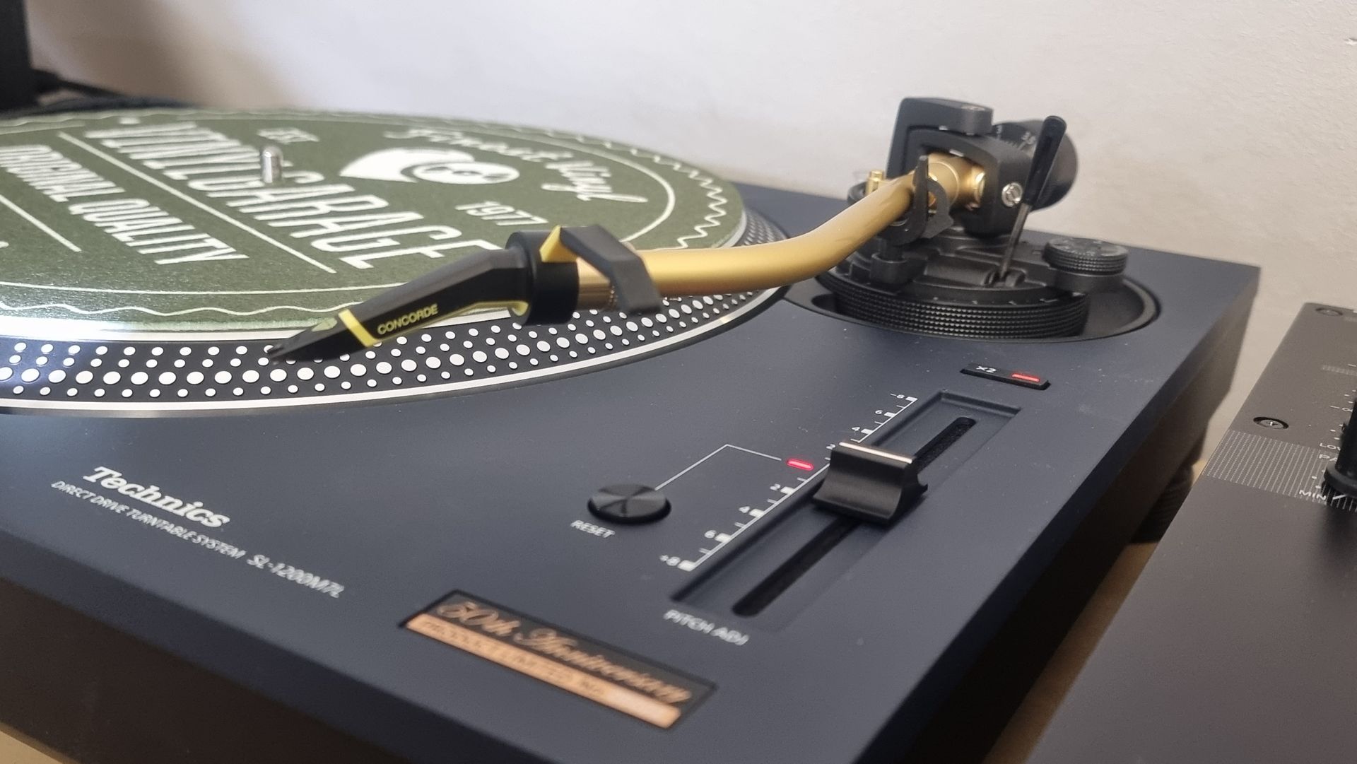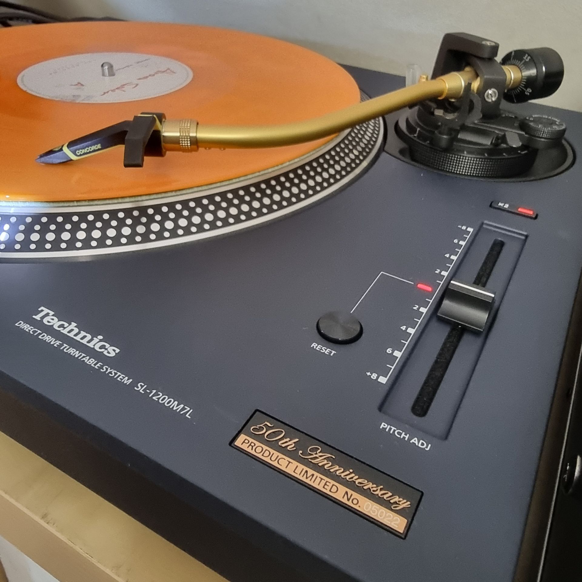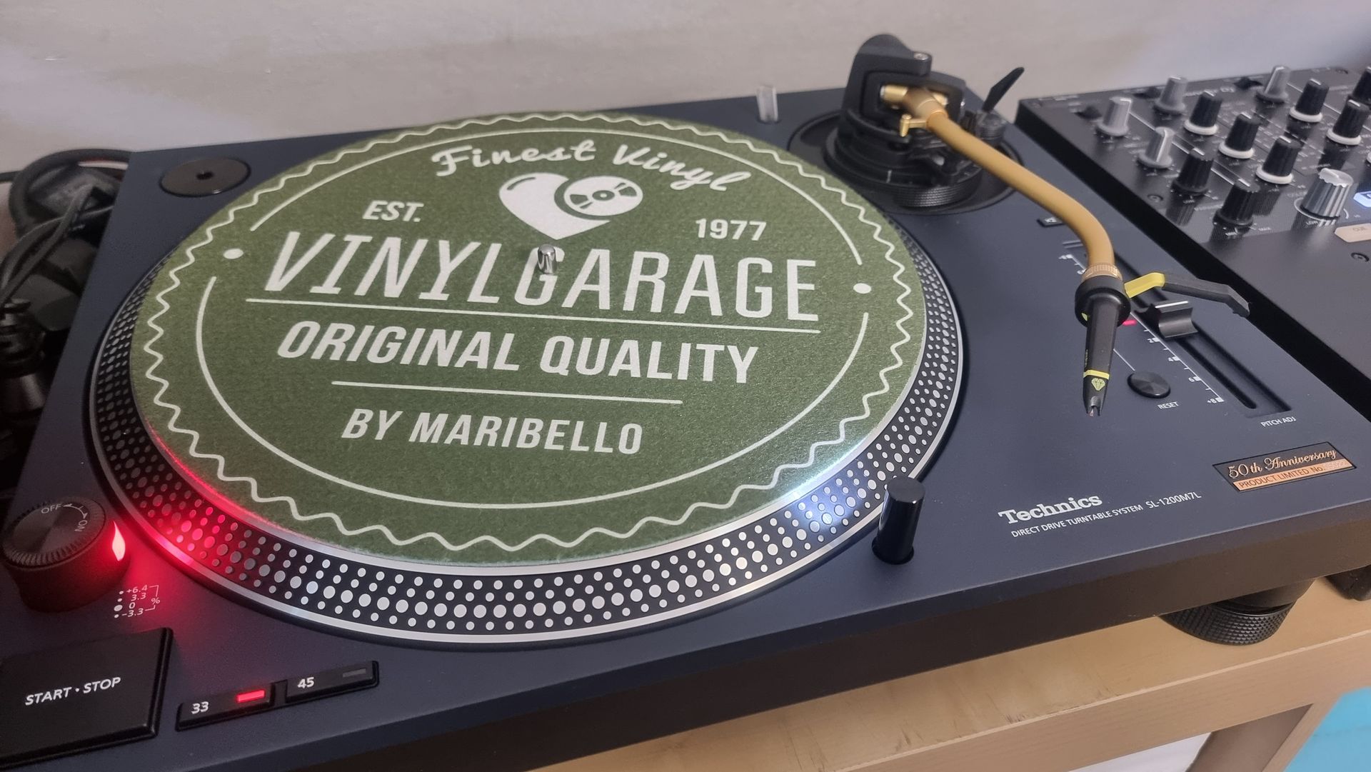 Ein Sondermodell zum 50. Geburtstag ist nicht alltäglich und weltweit auch nicht so oft gesehen. Ware Sammlerstücke. Wir haben einen der wenigen Technics 1200 mk7 LTD blue 50th anniversary Modelle bekommen. Viel hat sich da gar nicht getan gegenüber der ersten Variante. Der Plattenteller ist immer noch rund und die Schallplatten drehen sich auch immernoch in 33 oder 45 Umdrehungen pro Minute. Alles ist an seinem gewohnten Platz. Taster, Pitchfader, Tonarm... es hat sich optisch nicht viel geändert. Welches Utensil der Zeitgeschichte kann dies schon von sich behaupten. Vielleicht noch der Sennheiser HD25 Kopfhörer, der uns genauso lange begleitet, wie wir Schallplatten sammeln und auflegen. Technisch sei der Motor und die Tonarmkomponenten gegenüber den älteren Baujahren (mk2, m3D, mk5...) etwas verbessert, führt der Hersteller aus. Im Design hat sich Technics aber für die Limited Modelle etwas besonderes einfallen lassen. Unser Modell hat eine dunkelblaue Feinstrukturlackierung, schwarze Taster, Fader und Tonarmaufhänung bekommen sowie einen goldfarbigen Tonarm. Da der mk7 LTD viel zu schade für die Straße ist, haben wir ihm einen Ehrenplatz im Büro gegeben.