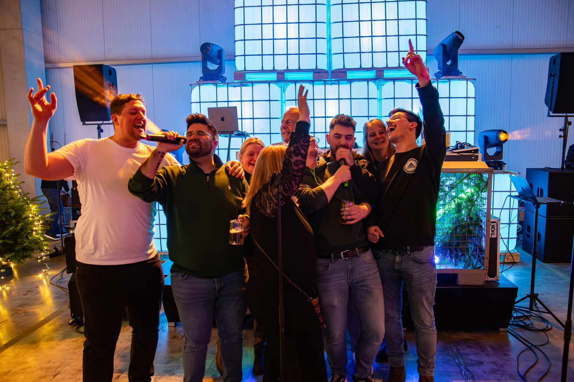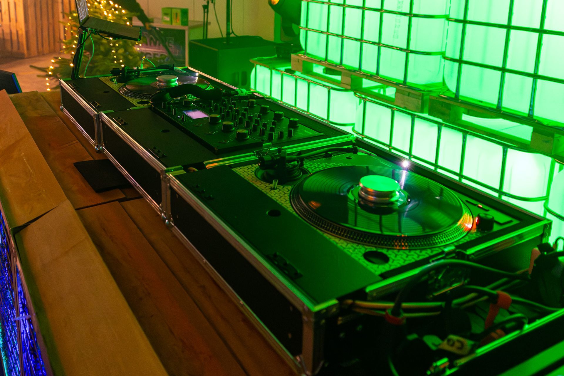 Mit High-Power Akkuspots haben wir die Container effektvoll in Szene gesetzt und ihnen eine völlig neue Wertigkeit verliehen. Technisch, klar, modern – und trotzdem weihnachtlich. Aus Gitterboxen aus dem Lagerbestand entstanden stilvolle Stehtische sowie ein clever inszeniertes DJ-Pult, beide illuminiert mit Akku-Pixeltubes.